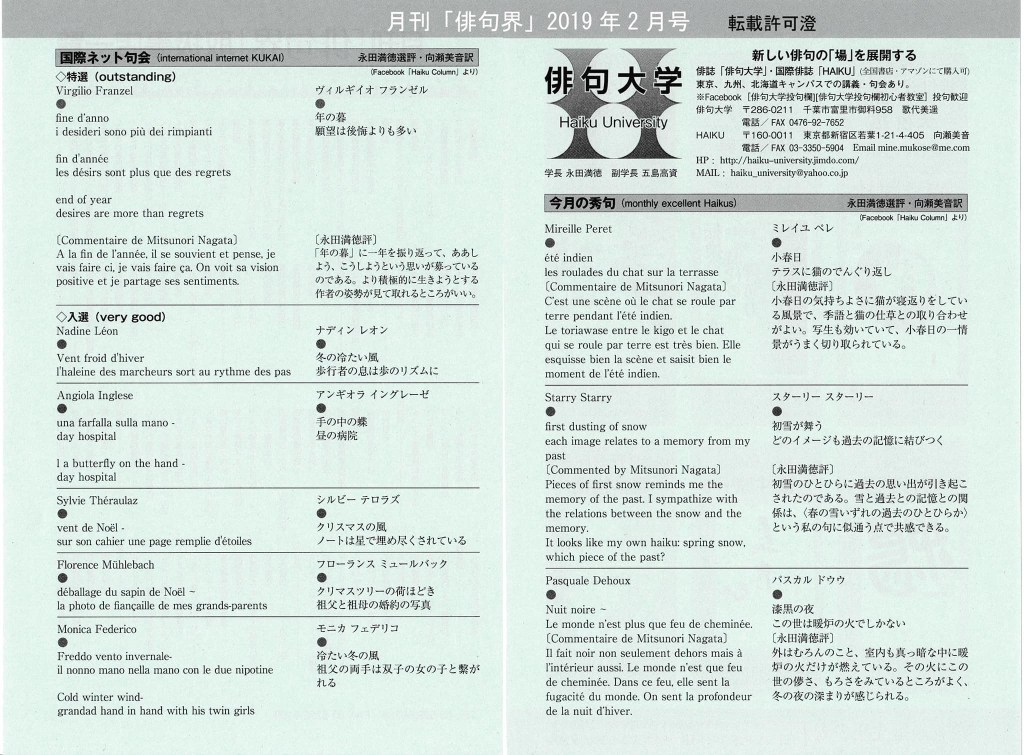 Mes vifs remerciements à Nagata Mitsunori pour la sélection et la publication de ce haiku comme « excellent exemple » de toriawase.