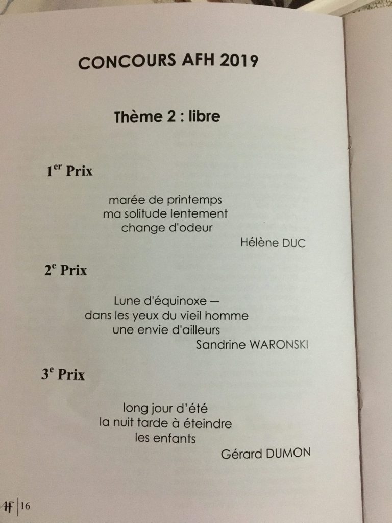 Quelle joie de découvrir dans le hors-série n°16 de la revue GONG les résultats du concours AFH 2019 avec 4 de mes haïkus retenus ! Un grand Merci au jury 😊