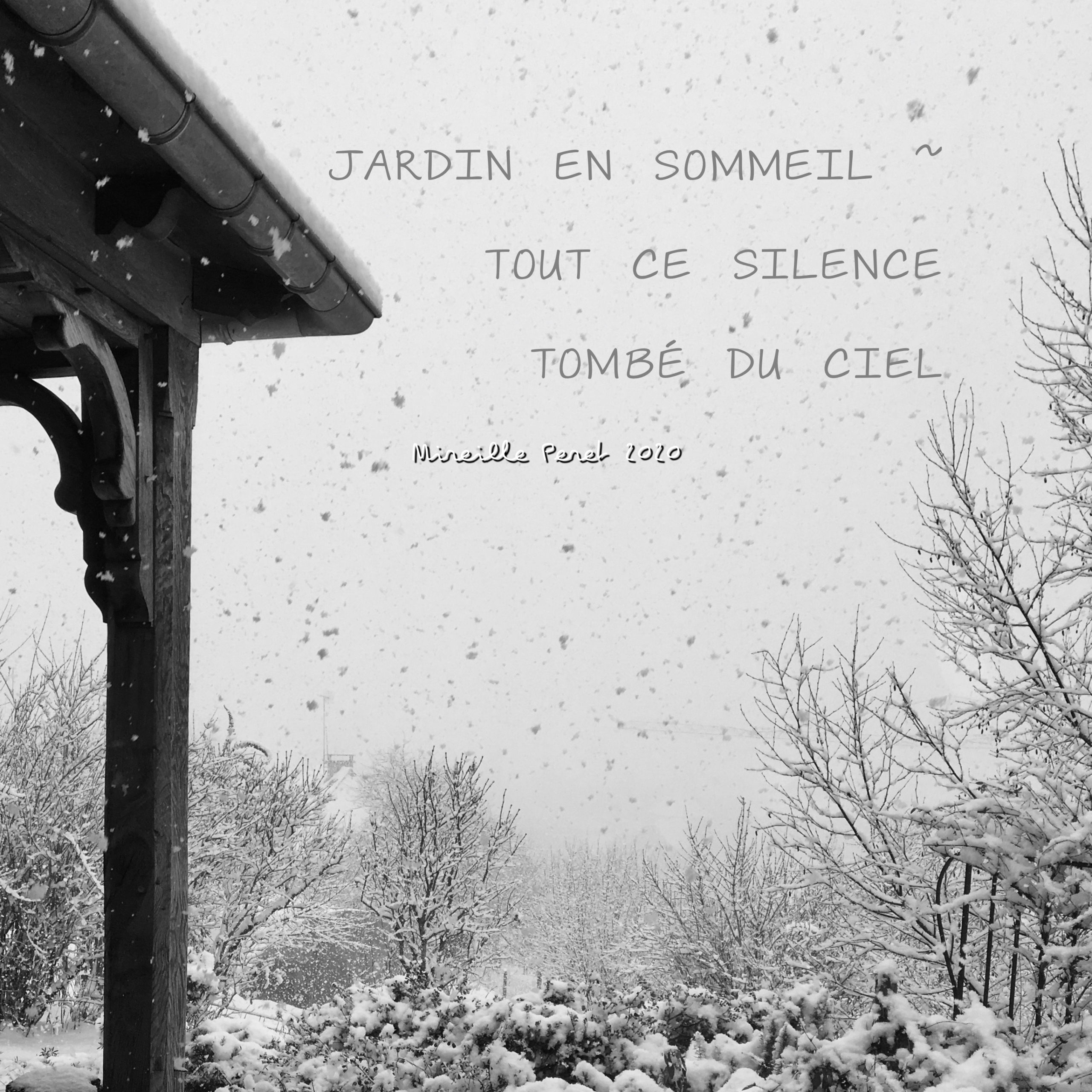 Sur la jolie photo de Mireille, notre regard se pose sur l’horizon de ce jardin enneigé, juste esquissé sur la gauche par une pergola. De nommer « silence », ces flocons qui virevoltent dans le ciel laiteux, donne une grande force poétique à ce haïsha.